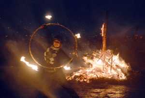 Kammi Matson spins a fire hoop on Sept. 13 at Mariner Park on the Homer Spit beach as…
