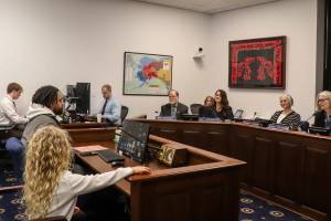 Juneau Assembly members confer with city administrative leaders during a break in an Assembly meeting Monday, Nov 18, 2024. (Mark Sabbatini / Juneau Empire file photo)
