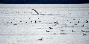 Surrounded by hundreds of common murres, an adult humpback whale shows its pectoral fin as it rolls in the water just outside the Don Statter Memorial Boat Harbor in Auke Bay on Monday. An increase in feed fish, herring, pollock and capelin, have been keeping a variety of birds and marine mammals feeding in the area for the last two weeks.