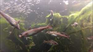 Pollock feeding on young herring: note the bulbous bellies on the pollock, and the hole in the school of herring where the pollock near the surface just attacked.