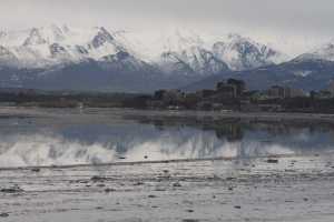 The Chugach Mountains and the buildings of downtown Anchorage are reflected in the still waters of Cook Inlet…