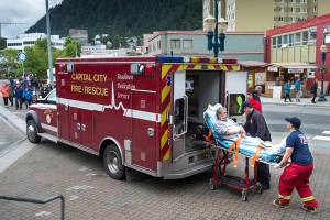 A Capital City Fire/Rescue crew transports a cruise ship passenger off the Radiances of the Seas downtown on Tuesday, August 14, 2018. (Michael Penn | Juneau Empire)